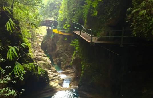 金刀峽位于重慶市北碚區(qū)金刀峽鎮(zhèn),華鎣山西南麓,是國家AAAA級旅游景區(qū)。傳說峽中有一把金刀,每當(dāng)夜晚時分,金光閃閃照耀峽谷,元朝末年,華鎣山下有一壯士張昆,此人早年靠采薪伐木為生,時常出沒于華鎣山的深山老林之中。一日,張昆迷失于一峽谷之中。當(dāng)夜正值月圓,柔柔的月光輕輕地瀉進峽中,張昆正陶醉于此情此景,卻見峽中深處有一事物在月光映照之下發(fā)出金燦燦的光輝。張昆近一看,原來是一把插入峽壁巖石的金刀。遂上前拔刀,不想紋絲不動嵌在石縫中的金刀竟被輕輕抽出。張昆大喜:天賜金刀,定是降大任于我也!張昆憑此刀披荊斬棘,終得以出峽,金刀峽也因此而得名。金刀峽全長約10公里,分上峽、下峽兩段,其中峽谷內(nèi)棧道全長近7公里。上峽由于喀斯特地質(zhì)作用,地面切割強烈,形成獨特的峽谷溝壑,兩岸石壁如削,山勢岈合,垂直高度超過百米,上有古藤倒掛,下有潺潺流水;下峽由于流水侵蝕作用,有眾多洞穴群,潭潭相連,碧玉串珠,飛泉瀑布層層疊疊,古鐘乳、石筍、石柱千姿百態(tài)。主要有驚魂臺、藏刀洞、懸天飛瀑、天犬洞、神鷹峽、獅頭峽、一線天、沙溪湖、中峽天然浴場、千幻古巖、彌勒佛、心形潭等四十多個景點。
