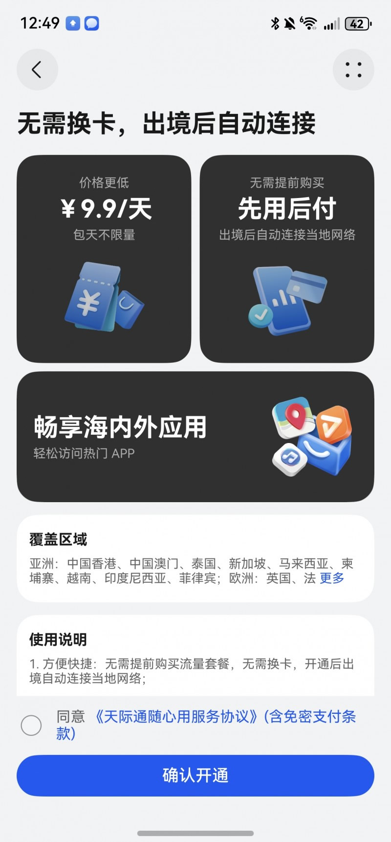緊接著,天際通第二重禮·隨心用——9.9元/天多地流量隨心用,針對多地旅行或深度游用戶,天際通推出「9.9元/天多地流量隨心用」服務(wù),用戶無需換卡,支持先用后付,按需付費(fèi)。每24小時僅需9.9元,享5GB高速流量+常速不限量,覆蓋歐美、東南亞等50個熱門地區(qū);單次開通長期有效,不用不扣費(fèi),聯(lián)程轉(zhuǎn)機(jī)無縫銜接。