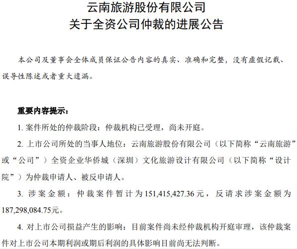 公司在今年2月發(fā)布公告,海力控股集團(tuán)有限公司與公司的全資公司云南旅游汽車有限公司所屬全資公司云南云旅交通投資開(kāi)發(fā)有限公司發(fā)生合同履行糾紛,海力控股就該合同糾紛向昆明市中級(jí)人民法院提起訴訟。因云旅交投認(rèn)為海力控股存在違約,對(duì)案件提起反訴。近日,公司收到昆明中院出具的《民事判決書(shū)》,判決由云南云旅交通投資開(kāi)發(fā)有限公司支付海力控股集團(tuán)有限公司工程款1.18億元及預(yù)期利息等。