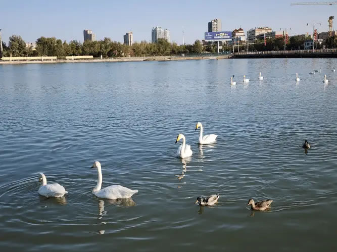 近日,一群野生白天鵝現(xiàn)身新疆庫(kù)爾勒市杜鵑河彭加木雕像附近水域。它們宛如久違歸家的“老友”,在水中歡快嬉戲,這也是今年首批來(lái)庫(kù)爾勒越冬的天鵝。天鵝如約而至,吸引了不少市民和游客駐足欣賞拍照,為梨城的秋天增添了一道迷人的風(fēng)景,也為節(jié)日增添了一份喜慶的氛圍。