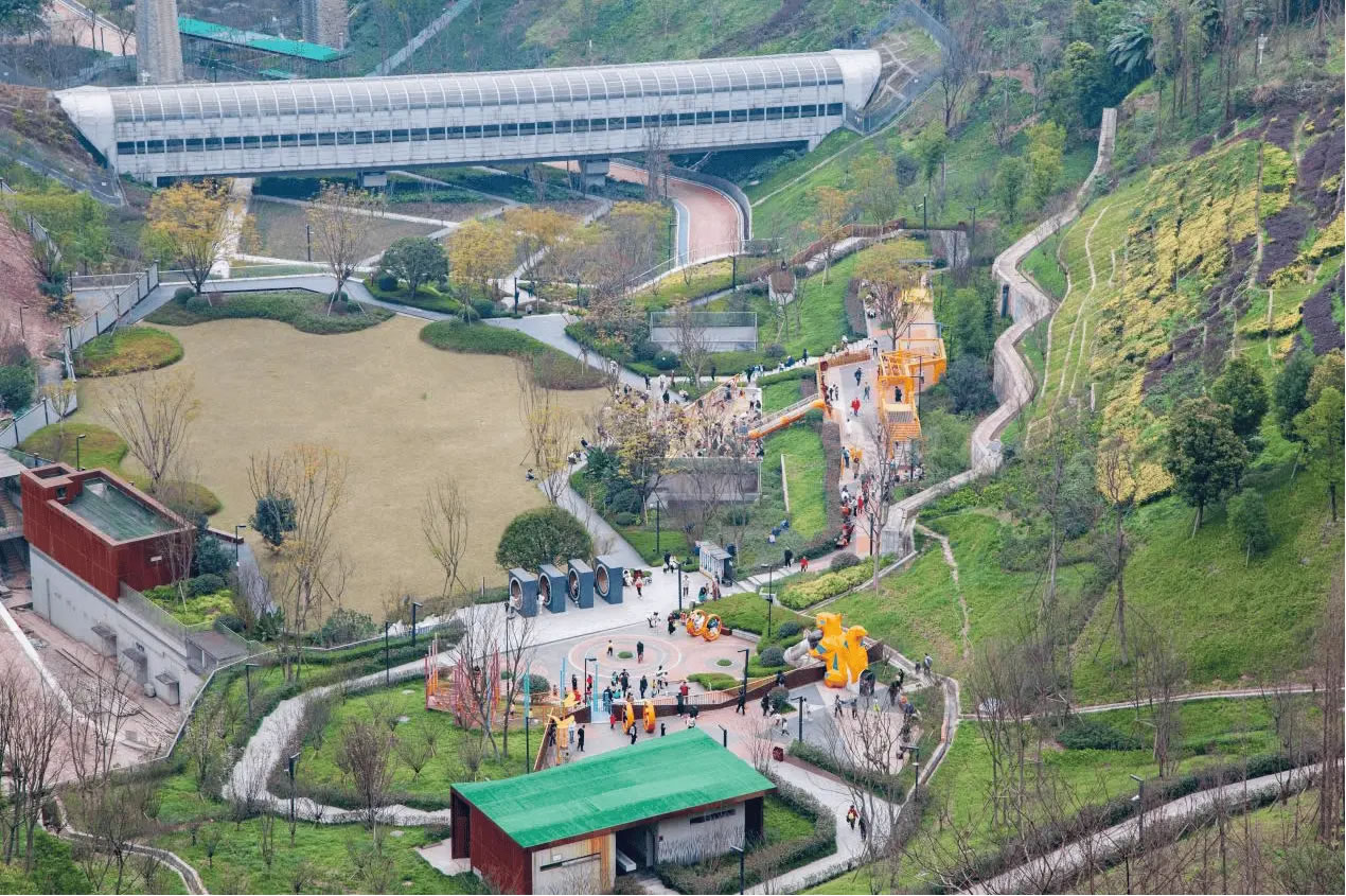依山就勢,渝中區(qū)推進21萬平方米坡坎崖由“禿斑”變“綠毯”、由“荒地”變“游園”、由“治理點”變“打卡點”。實現(xiàn)了鵝嶺—虎頭巖10.8公里山脊線綠蔭如蓋,長江、嘉陵江11.5公里濱水綠帶織綠成廊。渝中在紅巖公園充分利用“漏斗”地形,擋墻加固崖壁緩坡,生態(tài)復綠4.35萬平方米,中間平坦區(qū)域開辟為兒童樂園,入選全國兒童友好空間典型案例。