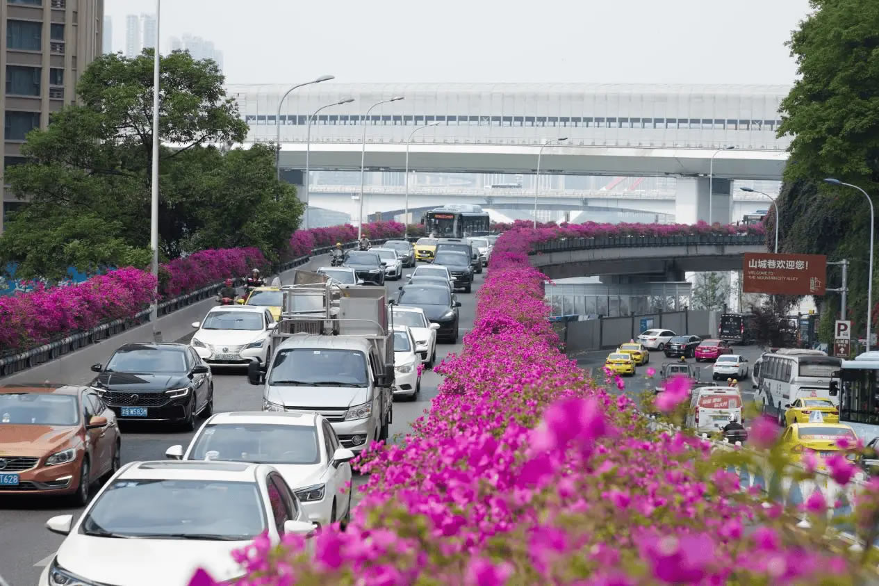 依托密集的立體交通網(wǎng)絡,渝中區(qū)聚焦立交高架、人行天橋、軌道墩柱,打造四季有綠、全年可觀的路上風景線,賦予城市交通色彩與活力。渝中區(qū)充分利用中興路高架橋兩側空間,通過鋼結構支撐,加掛耐修剪、易養(yǎng)護的三角梅花箱,形成500米空中花廊。