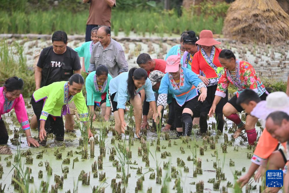 10月18日,在柳州市融水苗族自治縣安太鄉(xiāng)培秀村,村民們在稻田里進行抓魚比賽(無人機照片)。