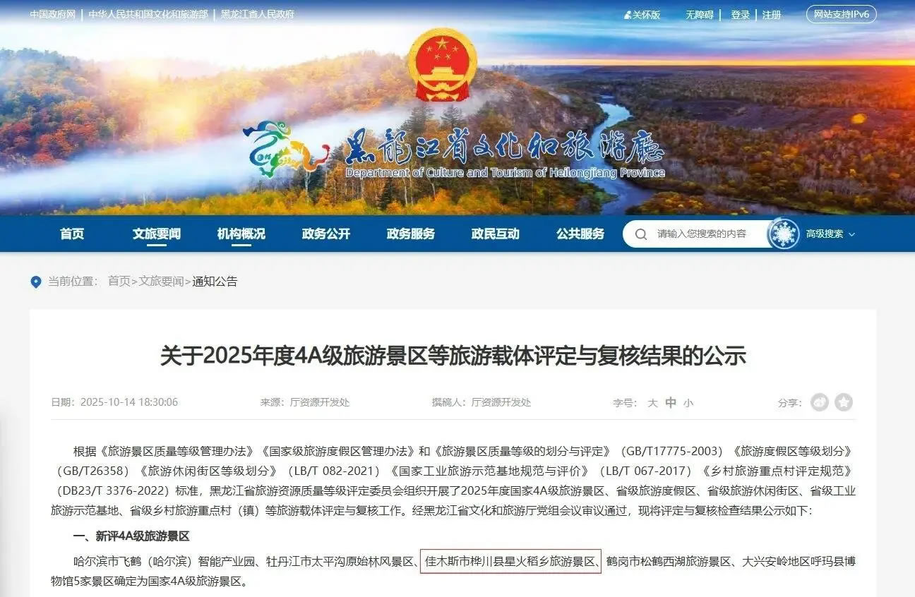 近日,黑龍江省文化和旅游廳發(fā)布2025年度AAAA級旅游景區(qū)評定與復(fù)核結(jié)果公示,樺川縣星火稻鄉(xiāng)旅游景區(qū)成功躋身國家AAAA級旅游景區(qū)行列。