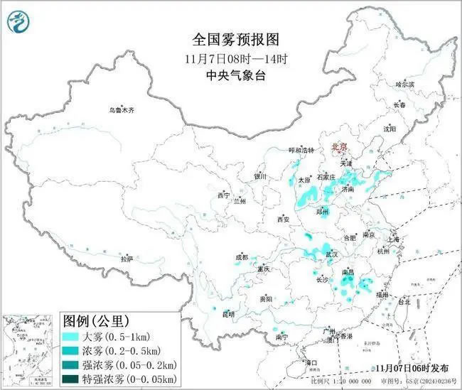 中央氣象臺今天(11月7日)06時繼續(xù)發(fā)布大霧黃色預(yù)警:預(yù)計,7日早晨至上午,河北南部、河南中北部、山東北部和東部、山西南部、湖北南部、江西中部、福建西北部等地的部分地區(qū)有大霧,其中,山東東部、江西中西部、福建西北部等地的部分地區(qū)有能見度不足500米的濃霧,局地有能見度不足200米的強(qiáng)濃霧。