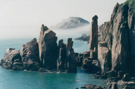 慈航普渡的觀世音菩薩在南麂列島定格、凝固成了高20米的天然巨像,它身披風(fēng)帔(俗稱“觀音兜”),垂著兩袖,眉目宛然,專注地向東海第面凝視。然而這觀音巖腳下全是刀劍般的礁石,潮來時淹滿水,更像是泥犁地獄了。而在不遠(yuǎn)的1.5米外,有5支石柱聳立,其中最高的柱頂,酷似調(diào)皮搗亂和小猴子。它在觀音菩薩面前,有所窺伺,又有所祈求。更令人驚奇的是,景隨步移,若南行數(shù)十步,從另一個角度望,慈目的妙齡觀音卻突然變成了老態(tài)龍鐘的南極仙翁,故人們又稱之“壽星巖”。移步換形不僅平尜游人興趣,而且從“雙面人”身上也不有同感悟。